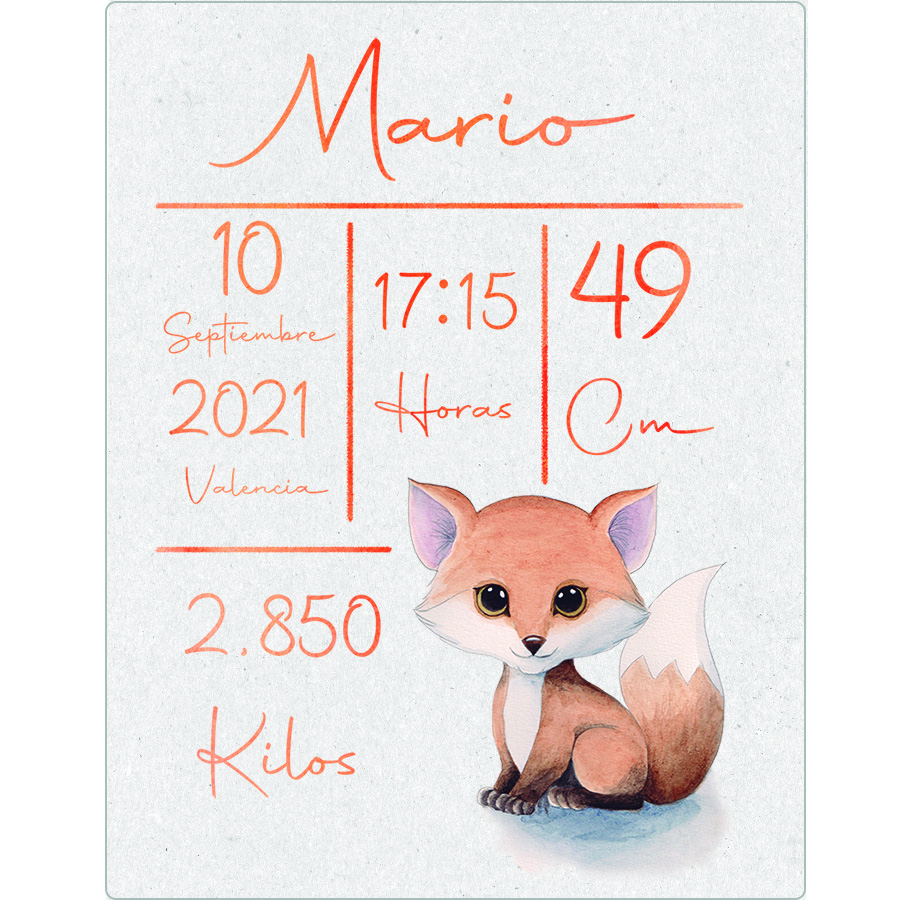 Puedes elegir entre tamaño A4 ó 30 x 40 cm, si lo prefieres con o sin marco (el marco es de color Blanco), y también puedes escoger el color, tipo de letra y animalito que más te guste.